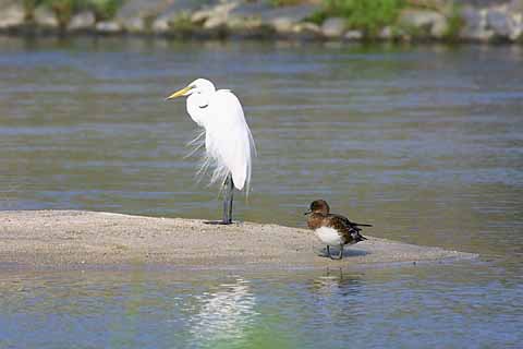 仕方なくもう一度、堰へ向かいますが堰付近には何も居ません。横の田圃にコサギとマガモくらい・・・。なんか調子狂うなぁ・・・とブツブツ言いながら矢倉橋へ戻ってるとダイサギとヒドリガモ♀がならんで羽繕い中。