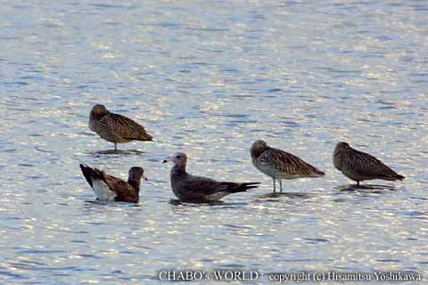 コーナーへ着くと砂の洲が水没したばかりって感じでホウロク、ダイシャクなどが休んでました。シギに混じって居るのはウミネコですかね。