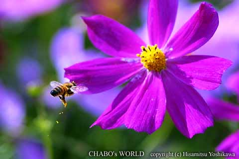 コスモスを撮ろうとしたらミツバチが花粉をまき散らしながら花から花へ飛び回ってました。
