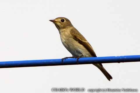 すると、外側の林から小鳥の声がにわかに聞こえてきます。慌ててヨンゴーロクを装着。一脚も付けて準備万端です。鳴き声のする方へ小走りに移動するとなんとコサメビタキさんが電線で鳴いてました。