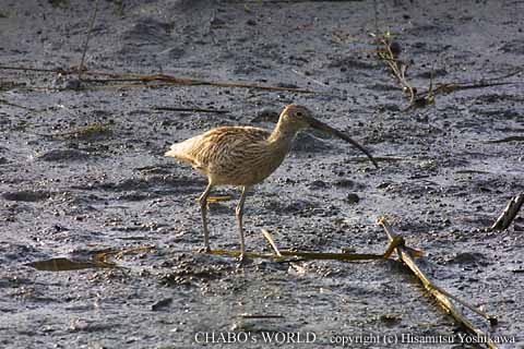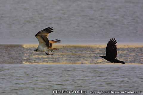 砂の洲に降りて食べようとするとまたカラスがやってきて追われるというのを繰り返す内、やっぱりカラスに餌を捕られました。(^^;