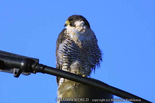 太郎丸へ向かうことにしたんですが県道は渋滞が始まっているので工場裏へ行くことにして瑞梅寺川沿いに湾の方へ向かいます。コハクチョウは今朝は姿が見えませんねぇ。電柱を中心に猛禽さんを探しながらリフレッシュ農場へ向かってるとハヤブサが電柱にとまってるのが見えました。