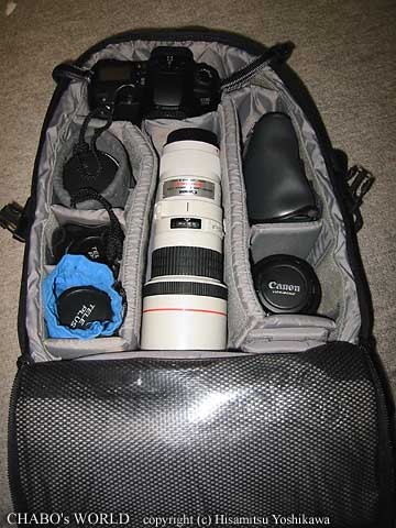 ![]() バックパックはLOWPROのミニトレッカーです。 D30+EF2+EF400と繋げた状態でぎりぎり納まる大きさです。コンパクトで背負った感じも違和感は無く、動きやすいです。 長玉買ったら(買えんくせに!)これの上位品のプロトレッカーってのにしようかな?って思ってます。 中身は左側にテレコン3種(x1.4 x2 x3)。右側に双眼鏡とEF50を常に入れてます。 @IXY-D200 |
