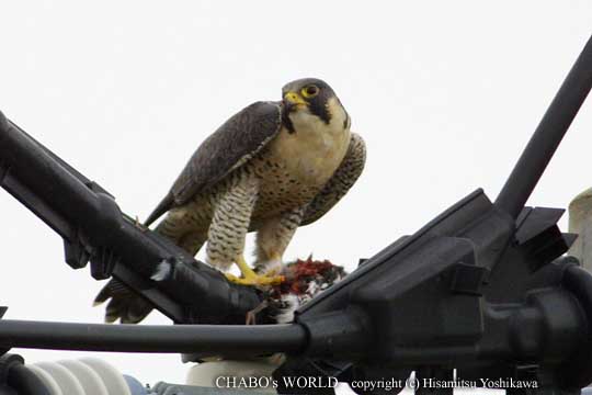 思ったより警戒心の弱い個体ですねぇ。10m程近づいても全く無視されてます。ハイタカも見れたし、太郎丸の方も見てみようと移動してるといつものハヤブサが獲物を持って電柱に飛んできました。今日はタゲリを捕まえてる様です。後を追うようにトビが2羽やってきてハヤブサは電柱から電柱へ飛び回ります。その内トビも諦めたのか旋回してるだけになりました。 |