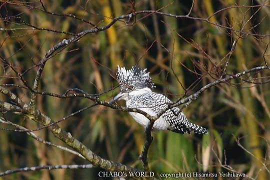 | ほたる橋の所で上流を見るとヤマセミさんが居ました。気づかれないように田圃の中をしゃがんで進みます。土手の影からこっそり撮影・・・・スタタタ。あっ、気づかれて飛ばれました。(ToT) やっぱブラインドか車じゃないと撮影は難しいようです。 |