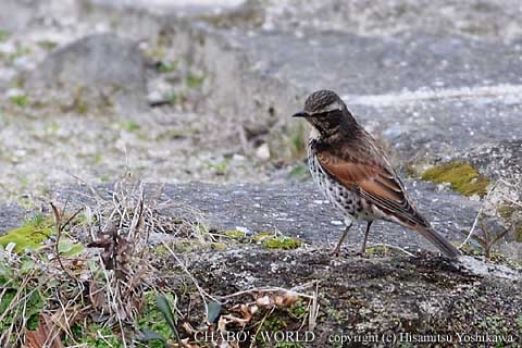 ![]() 水場の傍で地上に降りて餌を探すツグミ。 |