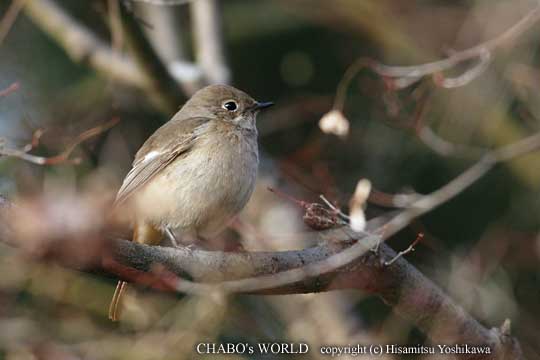 | あたりをぐるっと一周しますが肝心のオジロヒタキは居ません。心配になって國友さんにTEL連絡して確認したんですがやっぱ合ってる様です。 少し範囲を広げて探してるとヒタキ類の声? 振り返るとジョウビタキ♀が鳴いてました。 |
