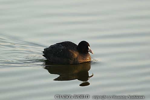 | 車を停めて見てるとハシビロガモの番が通行人を警戒してこちら側に寄ってきました。いつもは車のエンジン音でさえ遠ざかるのに。r(^^;; オオバンに朝日が当たって綺麗です。この子も逃げないですねぇ。ノートリです。 |
