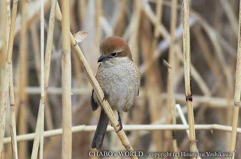 | 少し下るとマガモ、カイツブリが浮かんでます。下流からユリカモメ達が一斉に上ってきます。もう目の前をスイスイって感じで気持ちいいですねぇ。 葦原にモズ♀が居ます。獲物を見つけたのか下の方を気にしてます。 |