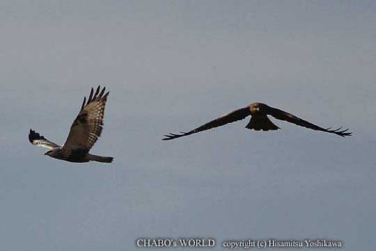 | カメラを構える時、サブダイヤルに触った気がしたんですよねぇ・・・しっかりプラス補正になって露出オーバー。(ーー;) おまけにピントは全然きてないし。(ToT) ハイチュウ♂は左から右へすす〜っと一直線に飛びました。その間数秒の出来事。 その後、帰還するまで戻っては来ませんでしたがとても綺麗なハイチュウ♂でした。 感動した〜。午後2時を廻ってもノスリ、ハイチュウ♀が遠くに出るくらいでしたので諦めて帰還しました。 今日は一人で行ったのですが現地でお会いしたSさん達や地元の猟師さんといろんなお話出来て楽しい1日でした。大変お世話になりました。 |