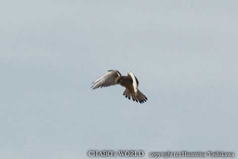 | この後、遠くへ飛んでちゃいました。 じっと待ってるのも暇なので先にウロウロしておきます。ケアシが去った方の谷にハイイロチュウヒ♀が舞ってましたが谷沿いなので見え隠れして撮れません。周りの林にはホオジロ、ホオアカ、カワラヒワ、ツグミ、モズなど居ました。阿蘇の鳥さんはどれも色味が濃い目でとても綺麗でした。 草原の奥の方も見ておきます。車でゆっくり移動してるとチョウゲンボウがホバリングしてました。遠かったけどとりあえず押さえておきます。(^^; |