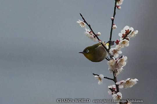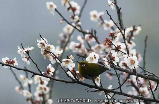 | 今朝は佐賀へ行こうかと早起きしたんですが向かう途中で気が変わって石釜で鳥見をすることにしました。r(^^;; まだ6時半なのに既に明るくなってます。ヤマセミポイントへ急ぎます。まだ日の出前なので鳴いてるのはヒヨドリくらい。ほたる橋の上からいつもヤマセミさんが止まる木を見るとまだ居ません。先回りして小屋の裏に隠れて待つ作戦ですが旨くいくかな? 橋を渡ろうと歩き出すと「キュロッ!キュロッ!」 え?後ろから?? 間もなく橋の上をかすめて2羽のヤマセミが川沿いに飛んできます。 が〜ん! まだカメラの準備もしてないのに〜っ!! ヤマセミさん達はそのままいつもの木を通り過ぎ遙か上流へ消えました。(ToT) 気を取り直してヤマセミさん達が行った方へとぼとぼ歩きます。窯元を越えた所の梅の木にメジロの群がいました。 |
