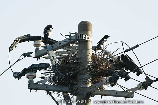 | 白飛びしないようにスポット測光で撮影。(^^; 河川敷上の道路脇の電柱にカササギの巣があり2羽のカササギが巣に戻ってきました。 このあたりは多いのかな?カササギが7羽群れて飛んでるのを見ました。 |
