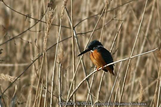 さて、今朝は携帯椅子も持ってきたし、堰下のカワセミさんを待つことにします。 じっと待ってるとヒクイナがいきなり足元から飛びました。これにはちょっと吃驚。アオジが相変わらず目の前を右へ左へ飛びます。が、葦原の中へ潜るので写真は撮れません。 ん〜、待つこと20分、8時になりましたがカワセミさんは出てくれません。諦めて田村大橋下流を見てみる事にしました。 葦原にはアオジとオオジュリンがたくさん居ます。日が射して綺麗なんですがちと遠いです。下流の方を双眼鏡で眺めるとマガモとアオサギくらい。カイツブリは今朝は見えません。しばし、オオジュリンを観察してると下流の方から「チーッ!」一直線にカワセミが飛んできます。目の前を通り過ぎ、20m程上流の葦に止まりました。あっ、飛翔写真はあっけに取られてまたしても撮れませんでした。(~~; |
