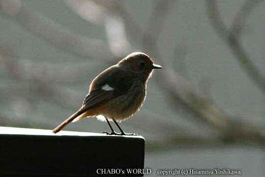 ここで少しビンズイさんに遊んでもらいます。頭上の木にはシロハラがプクプク言ってます。(^^; 横の方をみるとジョウビタキ♀が居ました。逆光で輝いてみえます。 |