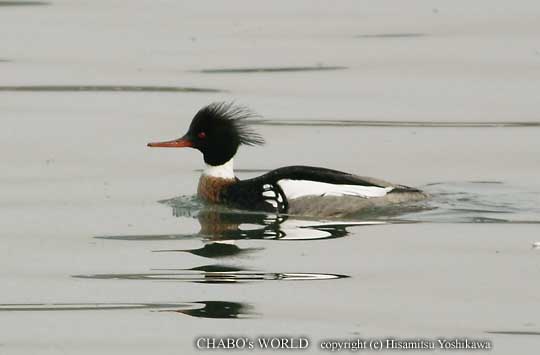 | 葦の洲横にはクロツラさんたちが居ました。ヘラサギも3羽混じってますね。(^^; それにしても冠羽も伸びてすっかり凛々しくなってきましたねぇ。 砂の洲の回りにツクシガモ、カワウ、ユリカモメ、頭巾を被ったズグロカモメ、ウミアイサ、カンムリカイツブリ、腹が黒くなりかけのハマシギ、ホウロクシギ2など。ウミアイサが近くを流れていくので久しぶりに撮影します。 |