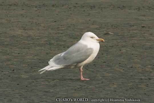 | 砂の洲のカモメたちを見てるとぽつんと1羽だけ白っぽい個体が居ました。 よく見ると風切りも真っ白です。もしかしたらシロカモメ?と兎に角撮りまくります。2倍テレコンだからMFなんですがここで失敗しては行けません。(^^; |