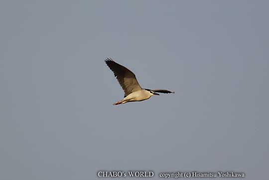 | 雌は葦原の中を転々としてましたが、並んで止まってくれると良かったんですけどね。 下流の方を双眼鏡で確認しますがマガモが浮かんでるくらいなので立花堰へ戻ります。 と、ゴイサギが上空を飛んで来ました。 |