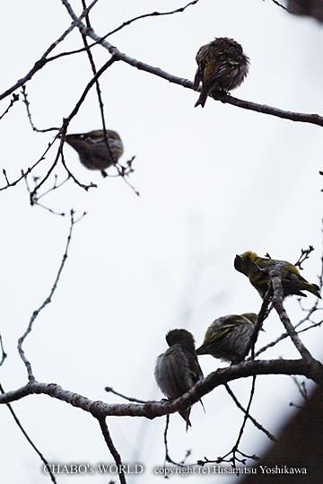 入り口近くの高木になにやら群れてますので覗いてみるとマヒワの群れです。逆光で空抜きなので旨く撮れません。 |