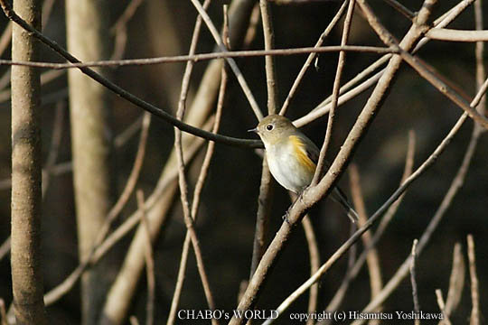 ミヤマホオジロ、シロハラの声も近くで聞こえてますが、なかなか出てくれません。 ツグミは櫨の実を食べてもじっと動きません。ツグミが居る間他の鳥さんが来ないような気がしたので公園の周りを散策することにします。 藪の中を覗いてるとルリビ♀が低い枯れ枝に止まってます。でも遠い〜。 居ることが解ったので出てくるまで待ちましょう。寒さに耐えてじっと我慢です。(^^; と、後ろの方が何やら騒がしくなります。振り返ってみると3m程の所にミヤマホオジロが4羽居て、餌を漁ってました。σ(^^;が振り返ると同時に飛んでお終い。r(^^;; 今度はジョウビ♂がやってきました。 |