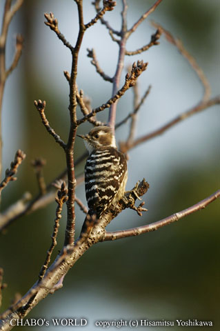 | 珍しく飛びませんねぇ。いい子です。(^^; 空はいつの間にか雲が切れ、日が射して明るくなってきました。 南斜面は犬の散歩中でビンズイが次々と林へ飛び込んでます。ん〜、ビンズイ撮りたいのでしばらく待機しますがぜんぜん駄目。諦めて山を越えて東側へ。 山頂付近ではツグミとエナガの声のみ。東側へ戻るとコゲラが2羽桜の木に止まってました。 |