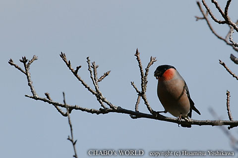 | さて、福岡ドームから帰宅後、一息ついて今度はホントの鳥見に出撃します。r(^^;; 天気はかなり回復して晴れ間が覗いてますねぇ。どこに行こうか迷いますが、とりあえず室見川を上っていくことにしました。 川原橋の工事現場付近でちょっと観察、カイツブリ、コサギ、葦原にモズがいます。 さらに上流へ、立花堰にイソソギ、ヒドリガモ、カイツブリが浮かんでます。矢倉橋上流はカメラマン一人。金武井堰でイソシギ、コサギ、マガモ、コガモ、井田尻橋に行くとバリケンは居ません。あっ、実は数日前石釜に行く時見てたんです。(^^; そのまま石釜まで行こうと思いましたが唐の原へ立ち寄る事にします。 現地に着くとトダニさんの車が停まってます。撮影準備をして裏の林へ向かうとミヤマホオジロの群れが居ます。撮影しようとすると飛ばれます。と、後ろからトダニさんが降りてこられました。「上の方はどうでした?」と訊ねると何も居ないとのこと。 折角上り始めたのだから駄目もとで行ってみます。が、やはりいませんねぇ。r(^^;; 裏を廻って表側へ出て暫くするとウソの声が聞こえてきました。6羽ほどの群が上空を旋回します。一旦は桜に止まったのですがカラスが鳴いてまた移動します。 その内、1羽だけ桜の木にとまり、その後3羽になって近くに来てくれました。 |