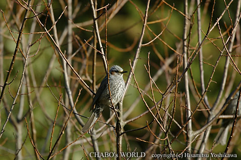 | 水が綺麗な分、気のせいか今津のカワセミより綺麗に思えます。(^^; この子は♂の様ですね。数カット撮った所で人が歩いて来たので下流へ飛んで行きました。 ヤマセミポイントへ向かいます。鉄の橋の所から上流を見ますが居ないみたい。いつものポイントまで行って待機します。一脚だと待ってる時が面倒ですね。じっと支えてないといけないから。r(^^;; 8時を過ぎてもまだヤマセミは現れません。日も射してきて絶好のシチュエーションなんですけど。。。 幾ら待っても来ないので諦めて少し上流へ歩いてみます。木陰に隠れているなら鳴き声くらいするはずなんですけどねぇ。その鳴き声もしません。川にはマガモが3羽居るだけ。今日は諦めますか。 車の所へ戻る事にします。下っていくとヒヨドリが頭上の木に止まってます。試しに手持ちで撮影。一脚ごと振り上げます。 |
