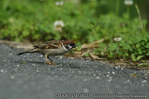 | 梅雨入りしてからまとまった雨はまだ降ってません。今朝も湿度は高めですが晴れの天気です。少し寝坊したのですが石釜へ出撃します。そろそろヤマセミが子供達を連れてくる時期なんです。(^^; ヤマセミポイントに到着するとすぐ、ヤマセミが茂みに入るのが見えました。 鳴きもせずさっと隠れる感じでしたが1羽しか居ないみたい。。。繁殖しなかったの? ヤマセミが出てこないので暫く待機します。待ってる間、スズメがやってたので撮影します。r(^^; |