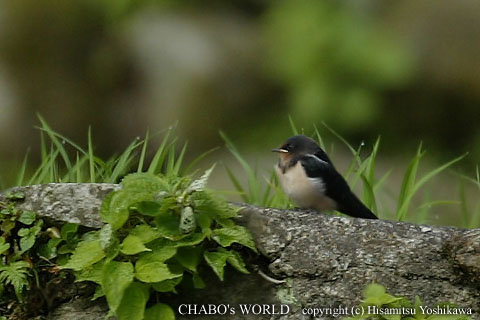 | 田植えが終わった田圃の上空をツバメが2羽舞ってましたが畦に降りて一休みです。 親子みたいで1羽はまだ幼いようです。 |