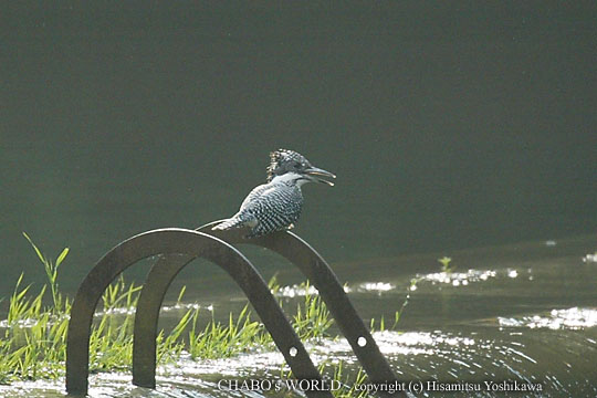 | 堰堤側の手摺に止まったのでこちらも堰堤へ降りましょう。鉄柵の所まで行くと飛ばれそうなので少し手前から撮影します。 |
