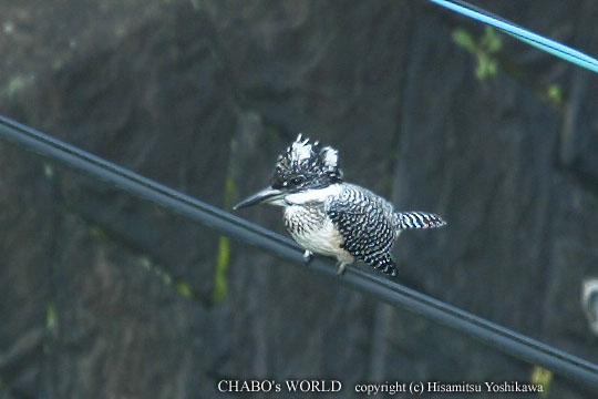 | 羽裏のみ褐色である。嘴の先端が白いことから成鳥♀だと思います。この後、奥の入り江に消えます。見えなくなった所で鉄柵へ移動して待機しますが一向に出てきません。鳴き声もしない。そういえば今朝は1羽のみですねぇ。8時になったので諦めます。堰堤からダムパークを見ると「あれ?電線に・・・」双眼鏡で見るとヤマセミが止まってます。堰堤手摺のスリットから撮影します。 |