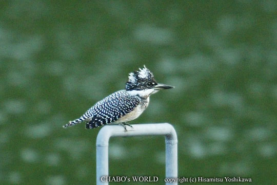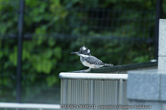 | おっと、オシドリに気を取られてる内にヤマセミは堰堤側へ飛びました。車を西側へ置いてたので一旦車に戻り、堰堤へ移動します。堰堤を越えて下流へ飛んだかも?と探してるといつもの手摺に止まってます。 |