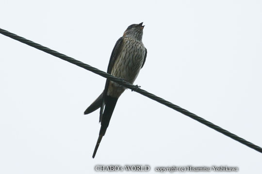 | いやぁ〜、いつもは対岸沿いに飛ぶのに今回はまっすぐこちらへ向かってきたと思ったら急旋回してダム湖中央付近を高度を上げつつ飛びました。正面からだと吃驚してシャッター押せませんでした。r(^^; ヤマセミは山を越え、谷間に消えます。ん〜、不思議な行動ですねぇ。 と、暫くするとまた山の上の方から出てきて高い位置を飛行して再び山へ消えます。 結局、この後、声すら聞けずでした。 堰堤付近で待ってる間、コシアカツバメが電線に来たのでパチリ。 |