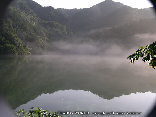 | 曇りのはずが晴れ間の覗く朝でした。日が射すとすっかり真夏って感じでジリジリと汗が滲んできます。曲淵のヤマセミの様子を見に行きます。 ダム湖に着くと気温差が激しいのか湖面に霧が発生して対岸は見えません。 |