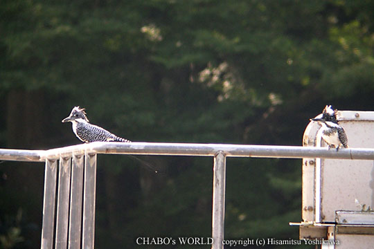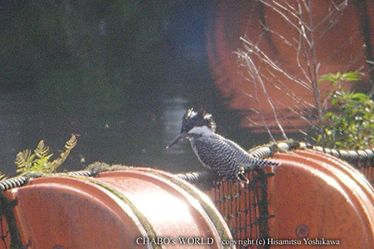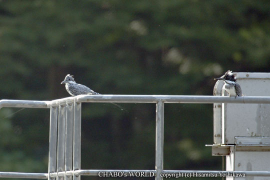 | やはり手ぶれが酷いですね。1/200でもぶれてるので三脚が華奢なのかも? 2羽のヤマセミは出てきたり消えたりと忙しいです。堰堤へやって来た時の写真を見ると1羽はまだ若い様で脇腹に褐色味があります。 |