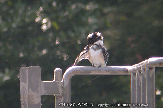 | 昨日、梅雨明けしたそうですが、今朝は朝から快晴の天気です。早速、曲淵ダムへ向かいます。 ダムへ到着すると釣り人さんが1名のみ。静かですねぇ。山の方からヤマセミの声が聞こえてますが、姿は見えません。ダイサギが対岸の松の木にとまったのでデジスコの練習。 結果はイマイチ。。。(ーー;) MFでもAFでもボケボケ連発と思ってたら手ぶれでした。r(^^; 7時も廻り、諦めて今津へでも行こうかと思ってた矢先、堰堤側にヤマセミの姿が。 取り敢えず偵察に行ってみると2羽のヤマセミが居ます。おまけに堰堤の上にはササゴイ! 慌てて車に戻り、機材を持って行きます。ロクヨンとデジスコをセットして撮影開始です。 |