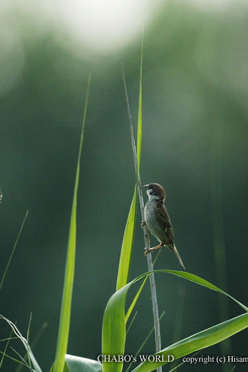 | 朝からルーターが壊れてInternetに接続が出来なくなってしまいました。メーカーにTELを入れても話し中で、結局、新品を購入。序でだったので100Mbps対応品にしちゃいました。(^^; では、鳥見日記です。 今朝は寝坊しまして7時に出発。今津へヨシゴイ探しに出かけます。江の口川水門から堤防へ入ると潮は満潮です。クリークを渡りふたつ池に向かうと既にdaruma-ppさんが来られてます。2羽のヨシゴイが居るそうですが鳴き声はすれども姿は見えず。ふたつ池周辺をウロウロしますが駄目ですね。r(^^; オオヨシキリもすっかりおとなしくなって地鳴きに替わってます。セッカは元気で飛び回ってますねぇ。葦原ばかり見ててもつまんないのでスズメでも撮影します。r(^^; |