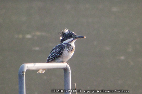 | 昨日取り付けたレリーズケーブルの威力を試す為、曲淵へ向かいます。 ヤマセミ親子に期待して行ったんですけどダム湖は靄ってて何も居ません。まだ時間が早いのかも?とじっくりと待つことにします。7時を廻り、だんだん霞が消えてきます。ジリジリと日差しも強くなってきました。(~Q~;) ん〜、我慢、我慢と思ってる所へ國友さん登場。話ながら待ってるとやっとヤマセミが出てきます。ブイの手摺に止まったのは♂ですねぇ。霞の中で条件は悪いですがレリーズを試さないと行けません。 |
