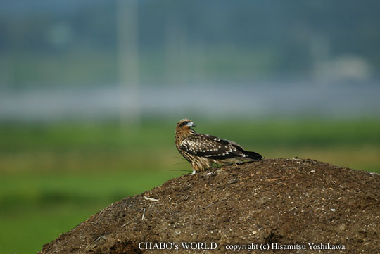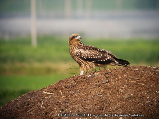 | カワセミたちは少しずつ離れていくし、そろそろ移動します。 國友さんと別れて太郎丸へ向かうと堆肥の上にトビが居ました。長玉とデジスコで撮り比べてみます。 |