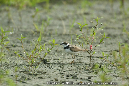 | 子供達が3〜4羽と親鳥1の様ですが田圃の中に入りなかなか出てきません。諦めて他を廻ります。昨日、ヒバリシギを見た休耕田は何もなし。周囲の休耕田を順に見ていくとコチドリ7羽が入った休耕田が有りました。 |