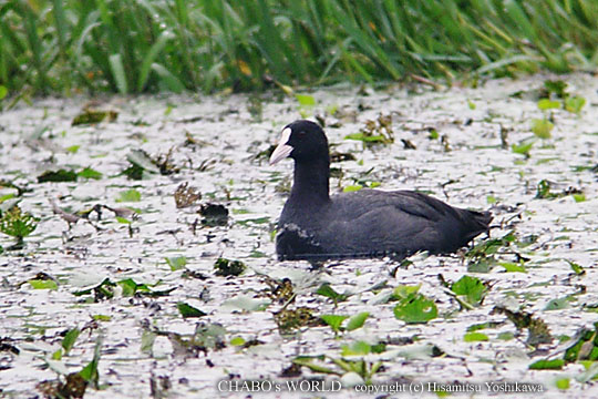 | 他に嘴が黄色い子供達と思われる個体も2〜3羽一緒にウロウロしてました。東の池をみてるとオオバンが1羽だけ浮かんでます。ちょっと遠いのでデジスコしましょ。(^^; |
