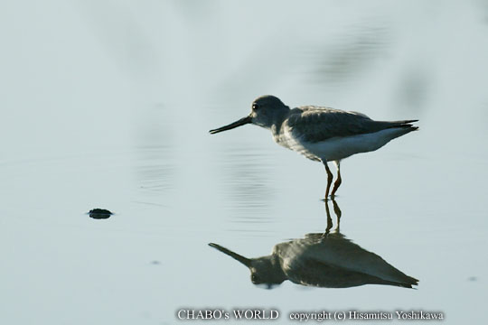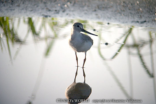 | 今日も良い天気です。昨日の好天で今津に何か入りましたかねぇ。今朝も今津に向かいます。田尻の蓮田を廻るとソリハシシギが1羽、今季初認です。(^^; 撮影しますがもろに逆光ですねぇ。敢えてシルエットで。。。 |