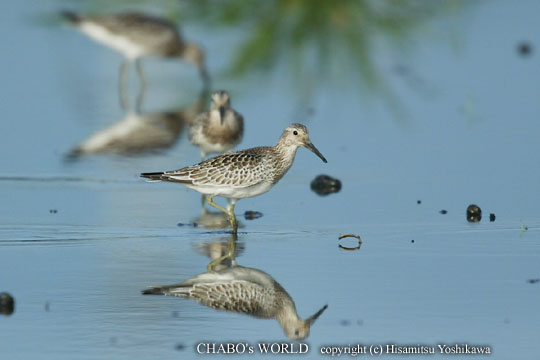 | やっと起きれました。r(^^; 天気もそこそこ良さそうなので今津へ出かけます。いつも田尻から見るので今朝は太郎丸から廻ります。いつものように休耕田を廻るとトウネンが目立ちます。少ない所で3〜5羽ですが10+の群れと20+の群れ、多いところには50羽くらいのトウネンが1枚の休耕田に入ってます。トウネンだけでも100羽以上は居ますねぇ。r(^^; 他はソリハシシギ10+、ヒバリシギ1、イソシギ2くらいです。太郎丸から工場裏へ行くと、トウネンに代わってタカブシギの群れです。こちらは10+でしたがソリハシシギ6+と一緒に行動してる様でした。工場裏から田尻へ向かいます。郵便局裏へ行くとオバシギ10とトウネン1が一緒にいます。 |