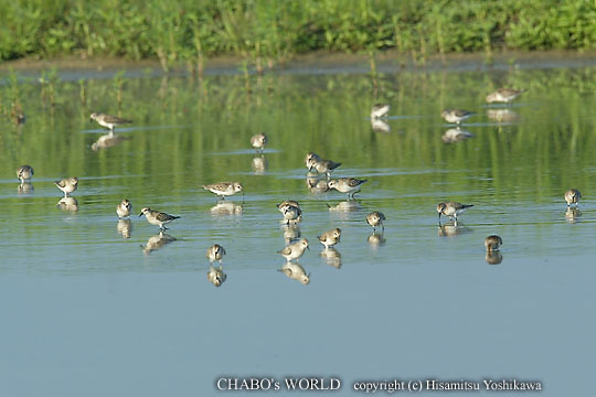 | やっと9月になりました。秋の渡りも本格的になり、山も面白くなりそうです。 とはいうものの、天気はまだまだ残暑が続くとか。(ーー;) さて、今朝も今津です。久しぶりに江の口川水門から堤防へ向かうと道端の草刈りも進んでいてコーナーまで後少しでした。草刈りが終わるとコーナーへ来るまで行けるので助かります。今朝の所はふたつ池へ廻ります。クリークの橋を渡り、ふたつ池へ。。。と、カワセミの後ろ姿がクリーク沿いに飛び去ります。 ふたつ池にはdaruma-ppさんの車が見えます。今朝もヨシゴイ狙いの模様です。取り敢えずふたつ池を過ぎて蓮田へ向かいます。と、daruma-ppさんからTELがあり、幼鳥が出てきたとの事。先に太郎丸とか廻ってからふたつ池に戻る事にして巡回を続けます。 田尻の蓮田横でヒバリシギ2、郵便局裏は何も無し。センター用地の除草委託はかなり進んでまして、なんとか渡り本番に間に合いそうです。 太郎丸へ行くとこの前トウネンが群れていた県道傍の休耕田に今朝も70+のトウネンが入ってました。 |