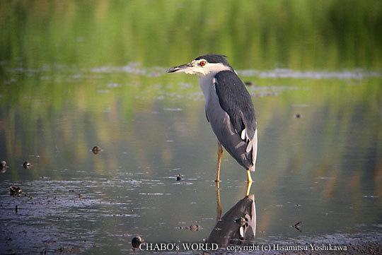 | 撮影後、廻りを見渡すと3羽のジシギが居ました。しばらくすると徐々に近づいて3羽とも同じ窪みに入りじっとしてます。あまり動かないので小屋の方へ移動します。 小屋の前ではソリハシシギ1とヒバリシギ1が奥の方を歩いてます。反対側をみるとゴイサギがじっとしてます。こういうのはデジスコで撮影します。 |