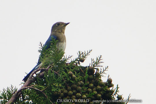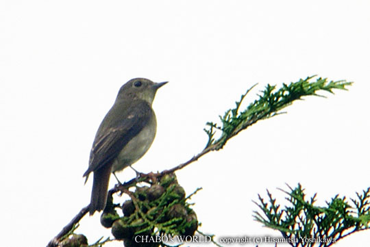 | かなり離れた所からでも大きく写せるので有り難いのですが上がりはイマイチですね。r(^^; エゾビタキ達は砂防を越えてどんどん山を登ります。だんだん他の声も聞こえてきます。 砂防の上の方まで歩いていくとエゾビタキ4〜5羽の群れとオオルリが一緒になって賑やかです。見晴らしの良い林道でじっと待ってると杉の木の天辺に止まります。 |