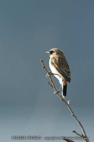 | デジスコのみ持ち出して歩いてるのでミサゴが頭上を飛んでも撮影できずで歯痒いです。 対岸を見るとメダイチドリと一緒にダイゼンが2羽居ます。今季初認。カモ類をみるとマガモにカルガモとヒドリガモです。クロツラさんを探しますが見つからず、潮が満ち始めたので車に戻ります。 水門へ戻り、上空をみてるとトビが群れて鷹柱を見せてくれました。と、いきなりメダイチドリ達が騒ぎ出したと思ったらハヤブサ幼が旋回し始めました。ん〜デジスコでは撮れず、どんどん上昇していく姿を望遠鏡で追うだけでした。 さてと、工場裏へノビタキを探しに行くことにします。稲刈りがあちこちで行われていて期待薄ですが、それでも山手の九大用地の廻りに6羽ほどの群れが風に飛ばされないように草の天辺でじっとしているのが見えます。ツバメとコシアカツバメも近くをビュンビュン飛び回ります。暫く車の中でじっと待ってると目の前の小木にやって来ました。窓越しに手持ちで撮影します。 |