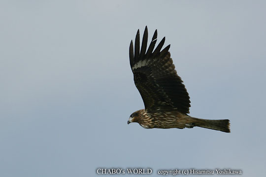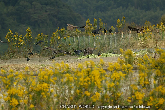 | トビは上空を旋回し、鷹柱のように舞って隙あらば野菜を頂く作戦のようでカラス達は地上でしゃかりきに野菜を食べてます。1羽のトビが近くを通過するので撮影します。 |