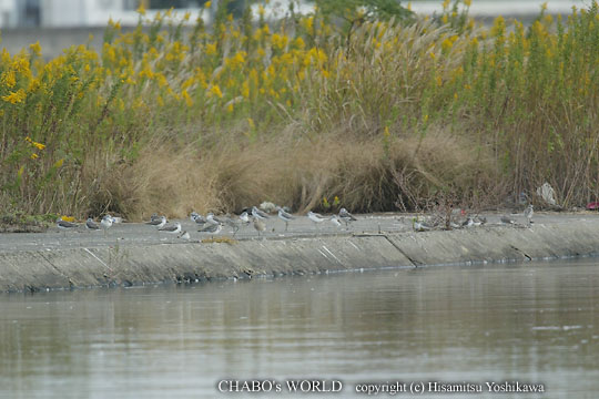 | 河口の下流の方を見るとシギチ達が集まって休んでました。 |