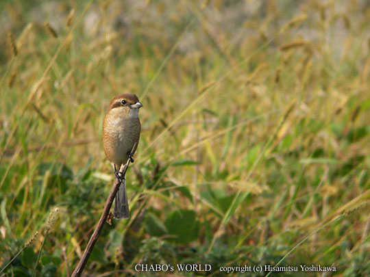 | 今朝はちょっと遅めで8時に自宅を出発、今津へ向かいます。 田尻の方からコーナー裏へ直接入り、コーナーへ上がると満潮です。上空をミサゴが旋回してますが生憎デジスコを持ってきたので撮れず。用地の草むらに居たモズに相手をして貰います。 |